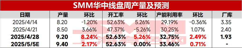 คาดว่าการผลิตเหล็กเส้นกลมในภาคกลางของจีนจะเปลี่ยนจากการเพิ่มขึ้นเป็นการลดลงในสัปดาห์หน้า ส่วนใหญ่เนื่องจากการหยุดการดำเนินงานตามแผนของสายรีดเหล็กเส้นกลมเพิ่มเติมในมณฑลหูเป่ย์ ซึ่งจะเริ่มตั้งแต่วันที่ 1 พฤษภาคม ซึ่งจะนำไปสู่การลดลงของอัตราการใช้กำลังการผลิต
