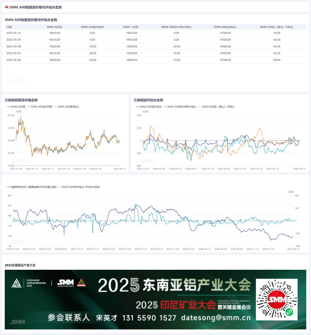 SMM 12 พ.ค.: ในช่วงเช้าวันนี้ ราคาอลูมิเนียม SHFE ปรับตัวขึ้น ทะลุ 19,800 หยวน/ตัน และพุ่งขึ้นเหนือ 19,900 หยวน/ตัน ในแง่ของการดำเนินการในตลาดสปอต บริษัทในภาคอุตสาหกรรมต้นน้ำในภาคตะวันออกของจีนแสดงให้เห็นถึงแนวโน้มการซื้อที่อ่อนแอเนื่องจากราคาที่เพิ่มขึ้นอย่างมาก ในขณะที่ซัพพลายเออร์มีความกระตือรือร้นที่จะขายมากขึ้น ส่งผลให้มีแรงกดดันต่อพรีเมียมสปอต โดยตลาดส่วนใหญ่ทำธุรกรรมที่ราคาเทียบเท่ากับ SMM วันนี้ SMM A00 อลูมิเนียมราคาอยู่ที่ 19,810 หยวน/ตัน เพิ่มขึ้น 200 หยวน/ตัน จากวันซื้อขายก่อนหน้า ทำธุรกรรมที่ราคาเทียบเท่ากับสัญญาเดือนพฤษภาคม ไม่เปลี่ยนแปลงจากวันซื้อขายก่อนหน้า