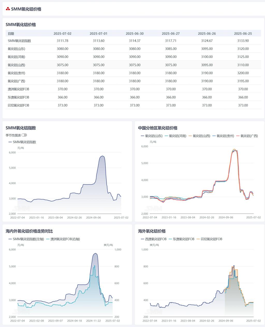 - การซื้อขายอลูมินาในต่างประเทศ: เมื่อวันที่ 2 กรกฎาคม มีการซื้อขายอลูมินาในต่างประเทศจำนวน 30,000 ตัน ในราคาซื้อขายที่ 361.6 ดอลลาร์สหรัฐ/ตัน FOB ทางตะวันตกของออสเตรเลีย โดยมีวันจัดส่งในเดือนสิงหาคม