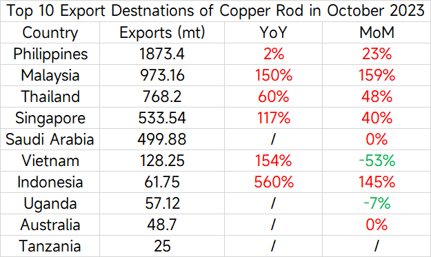 Xuất khẩu dây đồng thanh đến mười quốc gia hàng đầu trong tháng 10 cho thấy xu hướng tăng. Đáng chú ý, xuất khẩu sang Malaysia và Indonesia tăng đáng kể, tăng 150% và 560% so với cùng kỳ năm trước, và 159% và 145% so với tháng trước, tương ứng. Đáng chú ý là vào tháng 10 năm 2023, xuất khẩu sang Ả Rập Saudi, Uganda, Úc và Tanzania là bằng không. Tuy nhiên, vào tháng 10 năm 2024, bốn quốc gia này đã nhảy vào top mười điểm đến xuất khẩu dây đồng thanh của Trung Quốc. Ngoài ra, trong nửa đầu năm 2024, xuất khẩu sang Uganda đạt 27.8 tấn và sang Úc 24 tấn. Vào tháng 10, khối lượng xuất khẩu sang hai quốc gia này vượt xa tổng số của nửa đầu năm, cho thấy động lực tăng trưởng mạnh mẽ.