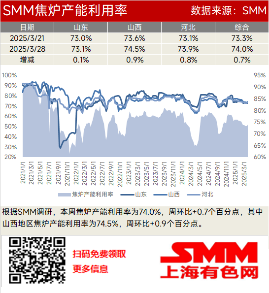[Độ sử dụng công suất lò cốc SMM] Tỷ lệ sử dụng công suất lò cốc tuần này là 74,0%.