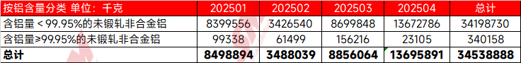 Theo số liệu của Tổng cục Hải quan, xuất khẩu nhôm nguyên liệu trong nước trong tháng 4 năm 2025 đạt khoảng 13.700 tấn, tăng 54,6% so với tháng trước và tăng 643,0% so với cùng kỳ năm ngoái. Từ tháng 1 đến tháng 4, tổng lượng xuất khẩu nhôm nguyên liệu tích lũy đạt khoảng 34.500 tấn, tăng khoảng 139,6% so với cùng kỳ năm ngoái.