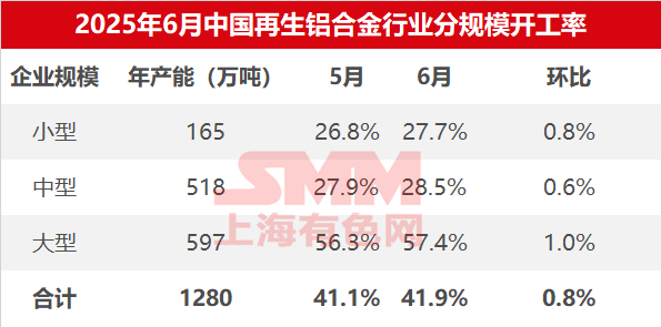 Dữ liệu khảo sát tỷ lệ hoạt động của các doanh nghiệp sản xuất hợp kim nhôm phụ theo quy mô trong tháng 6 năm 2025: