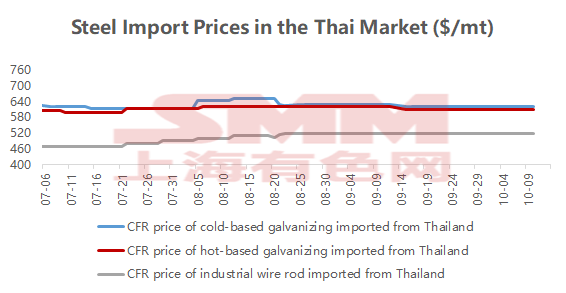 Trên cơ sở tuần này so với tuần trước, từ thứ Sáu trước kỳ nghỉ đến thứ Sáu sau kỳ nghỉ, giá xuất khẩu thép của Trung Quốc giảm 4-5 đô la/mt, chủ yếu do giá HRC giảm đáng kể, trong khi giá các loại thép tấm dày trung bình, thép cán nguội và thép silic vẫn ổn định. Trên thị trường Thái Lan, giá các loại tài nguyên chính cũng ổn định, với giá giao dịch CFR Thái Lan cho thép mạ kẽm ở mức 610-620 đô la/mt và thép dây ở mức 510-520 đô la/mt. Điều này chủ yếu là do trong thời gian nghỉ lễ kép, các nhà buôn Trung Quốc thường ít quan tâm đến giao dịch tài nguyên xuất khẩu. Đồng thời, theo một cuộc khảo sát gần đây của SMM, một số nhà máy thép đã tăng giá thép mạ kẽm cho tháng 10, với báo giá xuất khẩu tăng 5-10 đô la, trong khi giá thép dây dự kiến sẽ giảm. Tuy nhiên, xét đến sự sụt giảm liên tục gần đây của giá Trung Quốc và môi trường giao dịch không chắc chắn, hầu hết các doanh nghiệp hạ nguồn ở Thái Lan vẫn đang chờ đợi, khiến việc tăng giá bán của các nhà máy thép trở nên khó khăn. Do đó, giá dự kiến sẽ tiếp tục yếu và ổn định, với giá giao dịch thực tế vẫn có thể giảm.