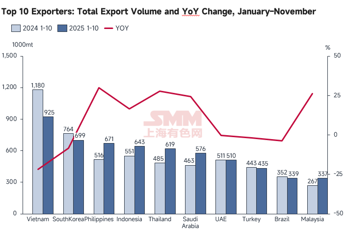 Theo dữ liệu từ Tổng c cục Hải quan do SMM tổng hợp, t tổng lượng thép xuất khẩu của Trung Quốc từ tháng 1 đến tháng 11 năm 2025 đạt 121,1127 triệu tấn, tăng 13,32% so với cùng kỳ năm trước. Theo quốc gia, Philippines tiếp tục là nước đóng góp lớn nhất vào mức tăng tích lũy so với cùng kỳ, với lượng xuất khẩu tăng 1,5523 triệu tấn, tương đương mức tăng trưởng 30,09%.